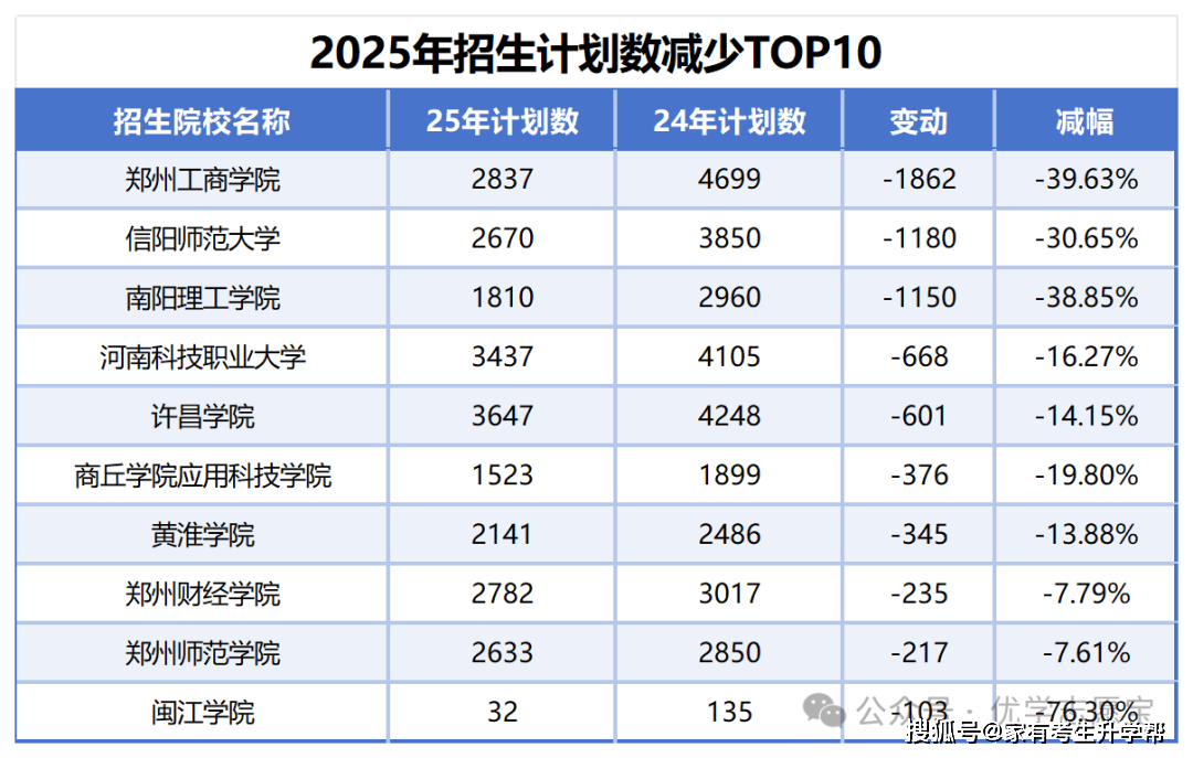 打算数减幅前三名为闽江学院、郑州工商学院和南阳理工学院,减幅别离为76。30%、39。63%和38。85%。此外,前十名高校里跨越30%的还有信阳师范大学,减幅为30。65%。