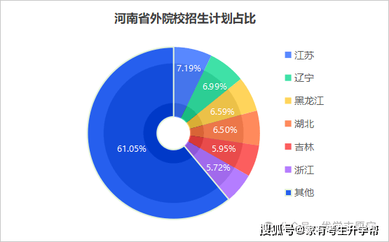 下图为除河南省外各省份正在河南省招生打算占比,排行前3的别离是江苏(占7。19%)、辽宁(占6。99%)和(占6。59%)。此中,江苏省有9002个招生打算,有8750招生打算,江苏高校数量较多,能赐与河南较多招生打算,也反映了其教育资本对外的辐射能力。辽宁和招生打算均跨越8000人。高校招生打算的添加可能是由于河南做为高考大省,是高校进行宣传和招生的主要区域。添加正在河南的登科人数,有益于高校吸引更多优良的河南学子报考,提拔学校的生源质量。
