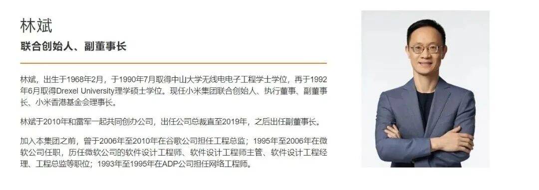 公开材料显示,林斌本籍揭阳榕城,1968年2月出生于广东省广州市,现任小米集团结合创始人、施行董事、副董事长、小米基金会理事长。并正在美国德雷塞尔大学获得计较机科学硕士学位。1992年结业后,林斌正在美国从动化数据处置公司(ADP)担任软件开辟工程师。1995年插手微软公司,先后担任软件开辟工程师、从任开辟工程师、研发司理、工程总监等职务。2000年,他回到中国担任微软亚洲研究院研发司理。2006岁尾,林斌插手谷歌中国,担任工程研究院副院长及谷歌全球工程总监,担任挪动搜刮取办事的团队组建取工程研发。2010年,林斌取雷军等人配合开办小米科技,出任总裁,担任公司日常运营、团队组建、供应商合做及国际营业拓展。2019年,他被录用为小米集团副董事长,继续担任手机研发等焦点营业。