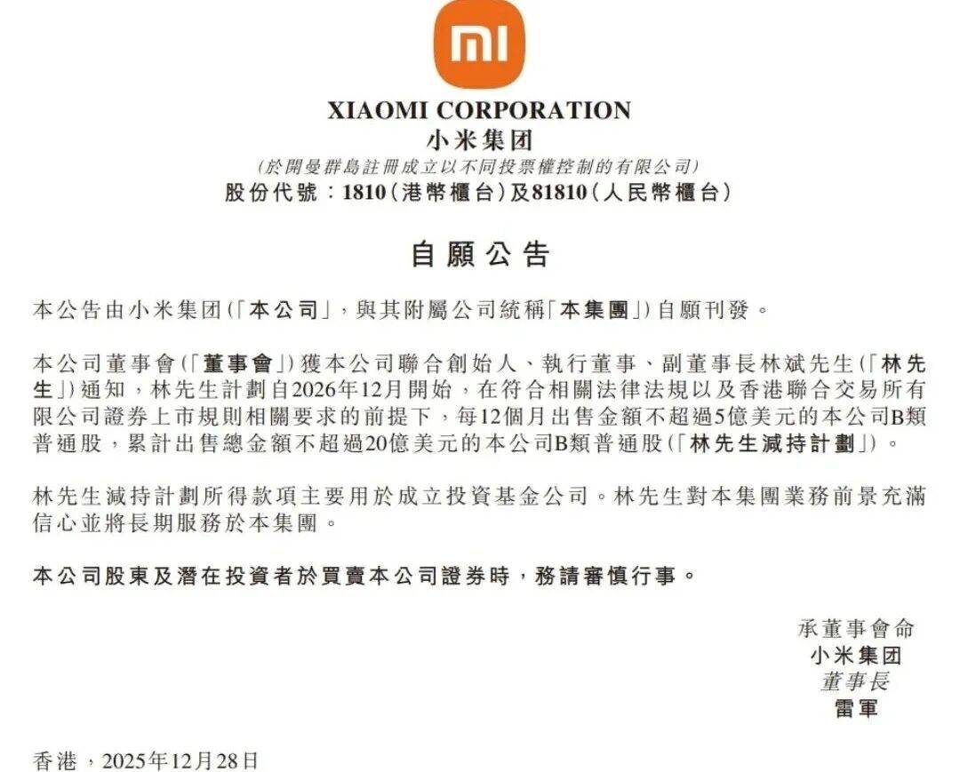 12月28日,小米集团正在港交所发布通知布告称,公司结合创始人、施行董事、副董事长林斌打算自2026年12月起头,每12个月出售金额不跨越5亿美元的公司B类通俗股,累计出售总金额不跨越20亿美元。