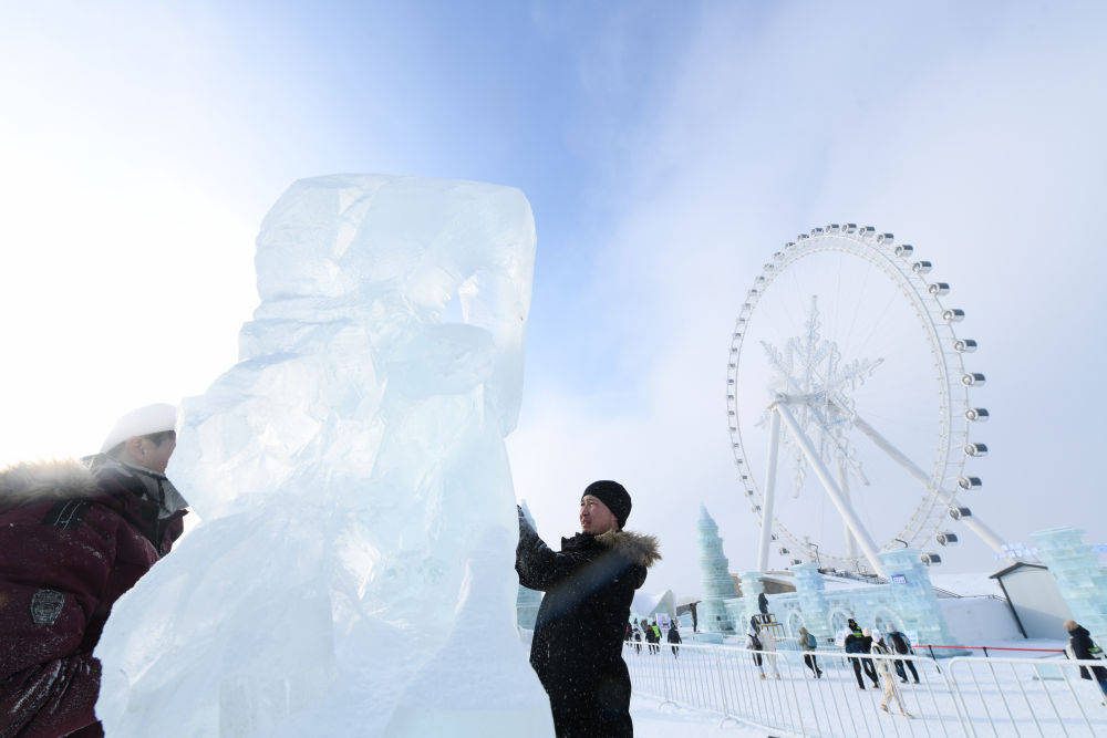 2024年1月3日,参赛选手正在冰雪大世界进行的第35届中国·国际冰雕角逐中进行冰雕创做。角逐有来自世界各地的30余支代表队参赛。